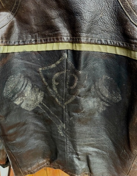 På ryggen finns ett blekt tryck av en klubblogga som med åren blivit så otydlig att den knappt går att urskilja. Det enda som fortfarande syns är två kolvar – ett motiv som förekommer i många klubbmärken.