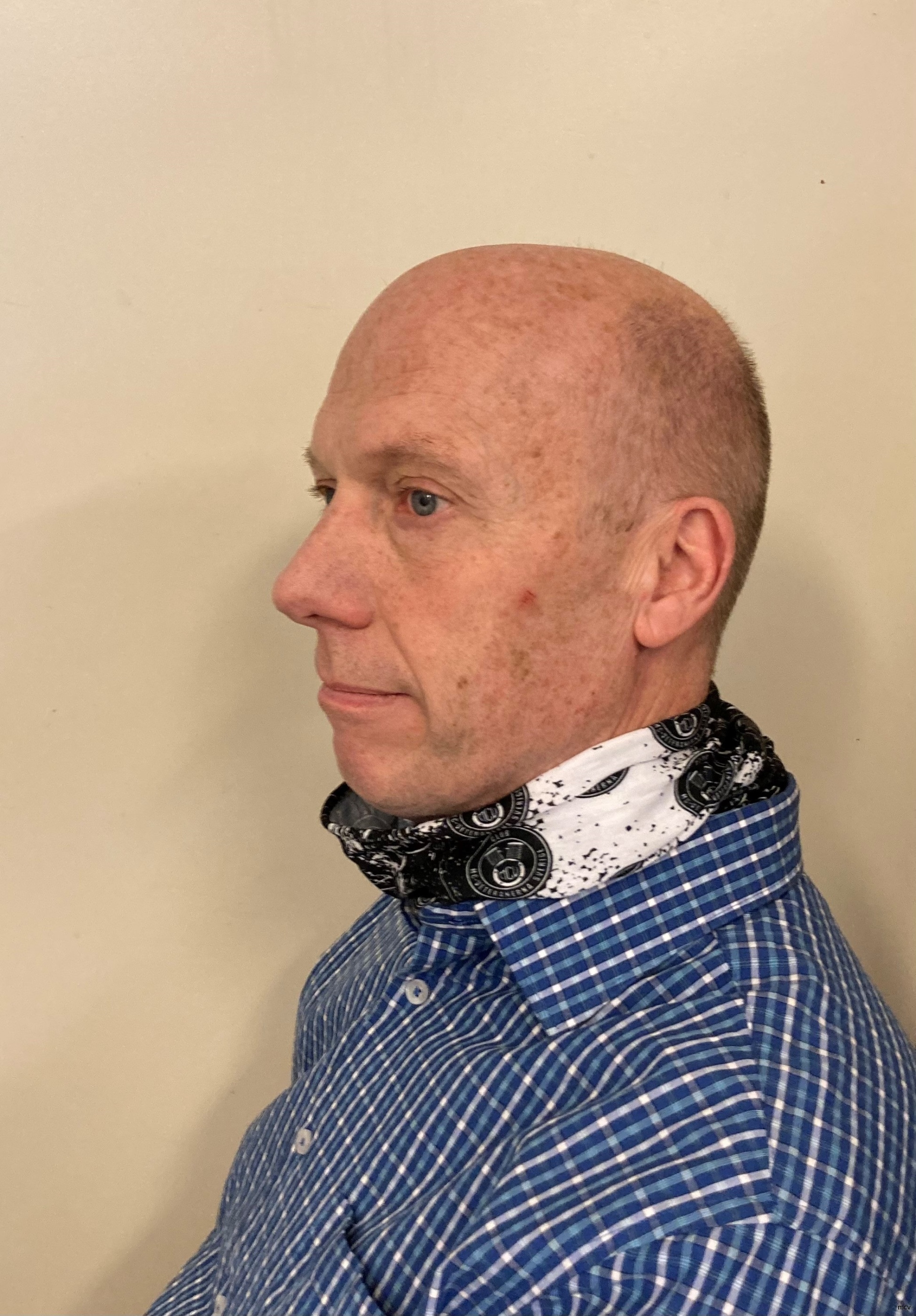 Svart, grön och röd t-shirt (Fristads, med vår logga i vitt på bröstet) samt vår buff (med eget tryck), och vår fleece-mössa med logga.